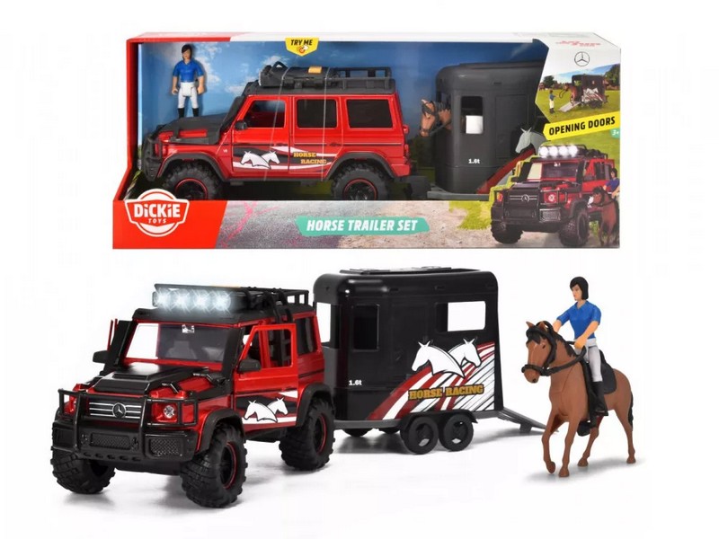 Dickie lószállító autó fénnyel és hanggal 42 cm Dickie terepjáró kiegészítőkkel. Ezzel a menő terepjáróval te leszel a legmenőbb, mikor megjelensz a lóversenyen! A játékszett minden szükséges elemet tartalmaz egy szórakoztató szerepjátékhoz, melynek csak a fantáziád szabhat határt. A lószállító jármű és utánfutója mellett egy ló és lovas figura is található a készletben. A mozgó alkatrészek mellett fény- és hanghatások teszik még izgalmasabbá a játékélményt a kisfiúk számára. A lovaglás és az autózás kedvelői most egyszerre kaphatnak meg mindent, amire vágynak. A jármű és vontatmánya kb. 42 cm hosszú. A csomagolás a szükséges elemeket tartalmazza.