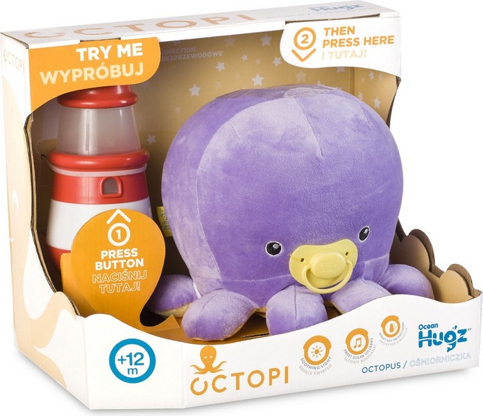 Engedd el magad és hagyd, hogy átöleljen az óceán friss fuvalata. Megjelent most az octopitól a kisbabák altatására kifejlesztett puha plüss. Ha a gyermek hozzá fekszik, a világítótorony, ami a csomagolás része, altatódalokat kezd játszani, enyhe fénnyel világít és a mennyezetre csillagokat vetít. A polipnak van egy kör alakú kerete, mely mentén a kis állatka lassan mozog és ezzel is megteremti a megfelelő hangulatot az édes álmokhoz.Ha a gyermek az állatkához bújik, a világítótorony altatódalokat kezd játszani, halvány fényben kezd világítani és a mennyezetre vetíti a csillagokat. világítótorony külön is be- és kikapcsolható, nem szükséges a plüsshöz érni. A világítótoronynak kör alakú kerete van, melynek mentén képes lassan mozogni A plüssállat 2 db AA-s elemmel (ceruzaelem), a világítótorony 3 db AA-s elemmel (ceruzaelem) működik, melyeket a csomagolás tartalmaz.