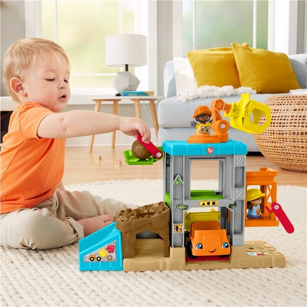 Az építkezés jó móka! A Little People építkezés pályaszettben az apró kezekhez illeszkedő gépek segítenek a képzeletbeli terveket megvalósítani. A gyerekek betölthetik, szállíthatják és kiönthetik a sziklákat. Van itt forgó daru, működő lift, egy billenős teherautó és két építőmunkás szakember. A játékot a zene és a mókás hangok teszik még izgalmasabbá.