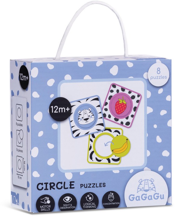 A GaGaGu egy a csecsemőkre gondolva létrehozott márka, multiszenzorikus játékok kollekciója, amelyek támogatják a fejlődést az élet első hónapjaiban, csak a szükséges ingereket szolgáltatva. Lehetővé teszi a gyermeknek a belépést a különböző textúrák, színek, hangok és motorikus kihívások világába. A fekete-fehér színvilág és a karakteres minták serkentik az apróságok látó érzékszervét, az erős színhangsúlyok pedig vonzó elemet jelentenek a valamivel idősebb gyermekek számára is, így a játék a gyermekkel együtt „nő”. Gagagu Bébi Puzzle – Körök olyan gyerekeknek készült, akik már elsajátították az alapvető kézi készségeket, és össze tudják egyeztetni az egyes elemeket. A készlet 8 db 2-6 részből álló rejtvényt tartalmaz, ami lehetővé teszi a nehézségi szint szisztematikus növelését a gyermek fejlődésének megfelelően. A különböző színek és formák megkönnyítik gyermeke számára a megfelelő puzzle alkatrészeinek megtalálását.