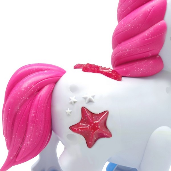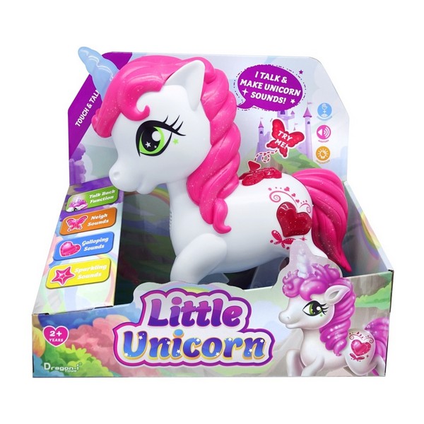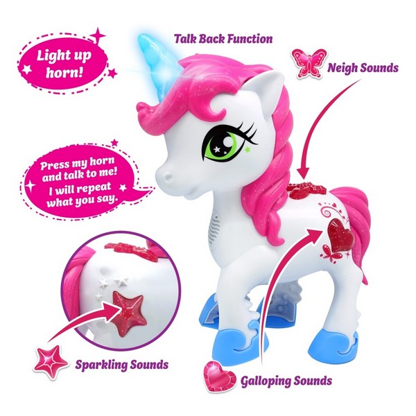 Minden kislány álma, hogy egy igazi, beszélő unikornis kisgazdája lehessen! Az interaktív beszélő Unikornis egy szuper oktató játék, amely bevezeti a gyerekeket az állati hangok világába. Emellett a Talk Back - beszéd ismétlő funkció ösztönzi a kicsiket a kommunikációra. Az imádnivaló unikornis, valósághű vágtázó és varázslatos, csillogó hangokat ad ki. A homlokán lévő szarva ragyogóan világít. Kedves bájával mindenkit elbűvöl. A játék 3 db AAA elemmel (mini ceruzaelem) működik, melyet a csomagolás nem tartalmaz!