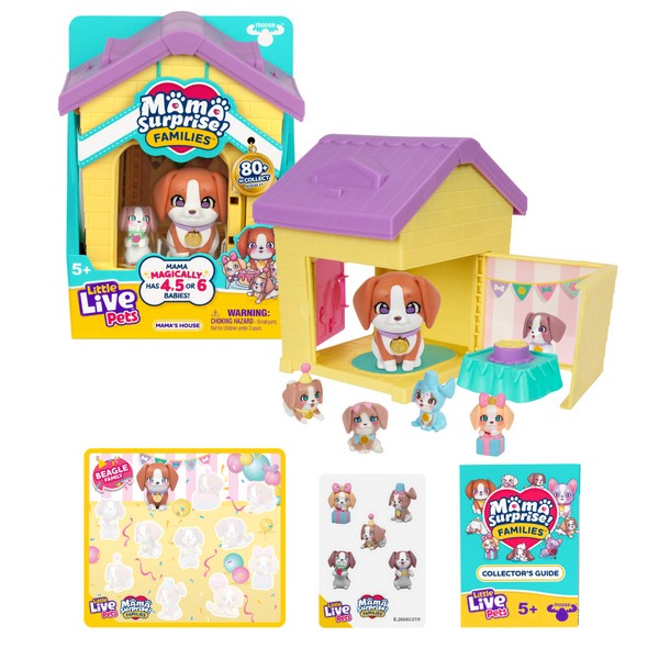 Fedezd fel a Little Live Pets varázsát a Mama Surprise Családok Anya Háza játékkészlettel. Minden házikóban egy imádnivaló meglepetés kiskutya vár rád. Nézzd meg, ahogy Mama varázslatos módon 4, 5 vagy akár 6 kiskutyát fogad. Egyszerűen töröld meg az arcát vízzel, és nézzd meg, ahogy az arcocskája rózsaszínűvé válik, jelezve, hogy készen áll. Helyezd Mamát a házba, csukd be az ajtót, majd nyisd ki, hogy felfedd a babát: ismételd meg a folyamatot, hogy mindegyik babát felfedezzed. Minden kiskutya egyedi és játékos arckifejezéssel rendelkezik, néhányuk extra bolyhos, míg másoknak mosásra van szükségük. A játszóház tematikus kiegészítőkkel egy vonzó játékkészletté alakul, és rengeteg helyet biztosít Mama és kiskutyái számára a felfedezéshez. Hét családot lehet összegyűjteni, köztük beagleket, huskykat, spánieleket, pudlikat, francia bulldogokat, és még egy limitált kiadású golden retriever családot is. Csomagolás mérete: 10.5 x 9 x 14.8 cm