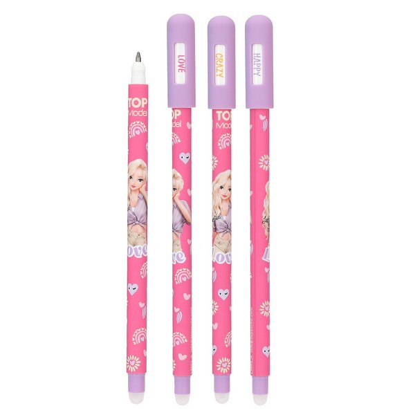 A TOPModel radírozható zselés tollak. A zselés tollak kék tintája könnyen letörölhető a toll kerek fehér végével. Három dizájn vagány divatos motívumokkal és mintákkal lila, pink és rózsaszín színben. Mérete: 16,7x1,2x1,2 cm.   ...    Részletek