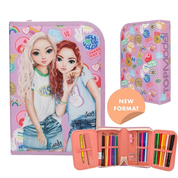 Fedezd fel a kreativitást a Topmodel szétnyitható Töltött Tolltartóval! A rózsaszín TOPModel tolltartó elején két gyönyörű TOPModel motívum található. Új fazon: kívül egy cipzárral, belül két kihajtható elemmel rendelkezik. Bőven van hely 12 filctollnak, 10 színesceruzának, 2 grafitceruzának, hegyezőnek, radírnak, vonalzónak, háromszög vonalzónak és egy kis tükörnek, amely alatt egy zseb található. Ez a tolltartó nemcsak praktikus, de stílusos megjelenésével és teljes felszereltségével is kiemelkedik, így tökéletes ajándék lehet minden kreatív gyermek számára. Anyaga: 100% poliészter. Mérete: 22x15,5x5 cm.