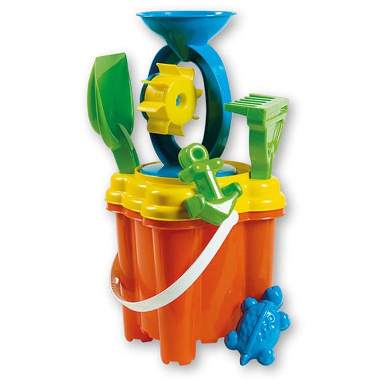 7 db-os homokozó készlet. Tartalma: 1 db 15x15 cm-es vödör, 1 db szita, 1 db lapát és gereblye, 2 db forma, 1 db malom.