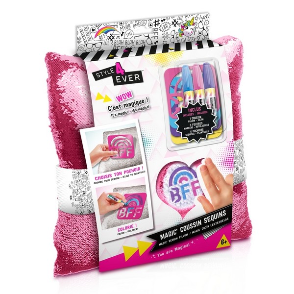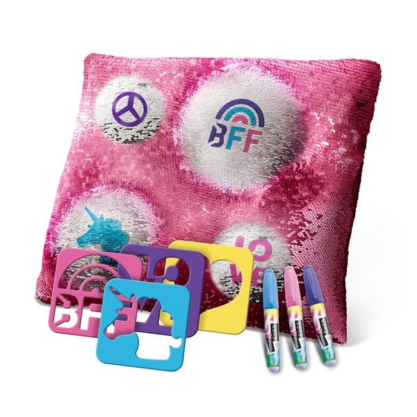 Imádni fogod ezt a mágikus flitteres párnát! Az egyik oldalán ezüstszínű flitterek díszítik, de ha kezeddel átsimítod, máris átváltozik csodálatos rózsaszínné! A készlethez sablonok és filcek is tartoznak, hogy még egyedibbé tehesd szobád díszét. Tökéletes ajándék minden álmodozó számára!