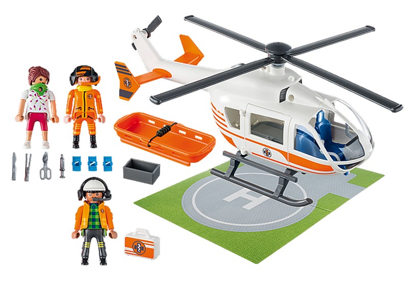 Helikopter leszállópályával. A sérüléseket a hordágyon szállíthatjuk. A rotorlapátok mozgathatóak. Mérete: 36 x 13 x 16 cm.