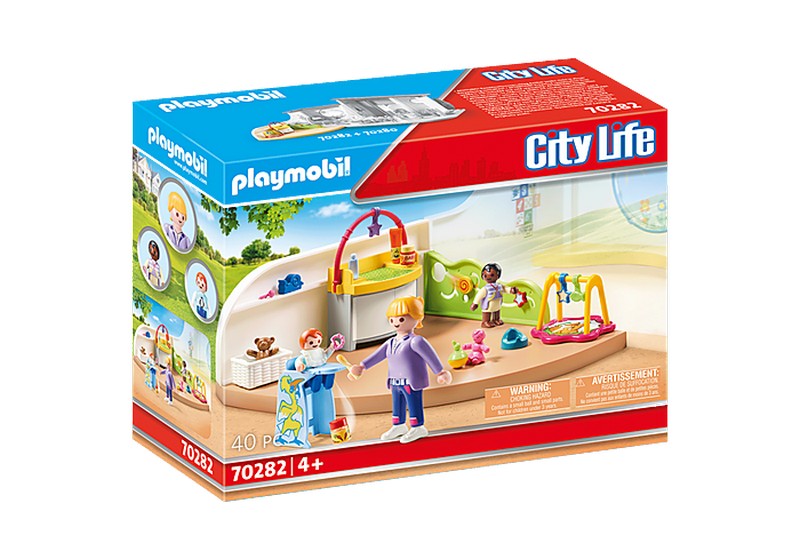 A kicsiket szeretettel gondozzák a bölcsőde kiscsoportjában. A dada éppen egy babát lát el a pelenkázón. A kicsi boldogan kapálózik és a fenti színes függőt nézegeti. Eközben a másik baba boldogan játszik a játéklappal, majd elindul a fal felé, ami annyira érdekes. A játékkészlet három PLAYMOBIL figurát, pelenkázót, játékívet és játékcímkéket, etetőszéket, motoros falat és még sok más extrát tartalmaz.
