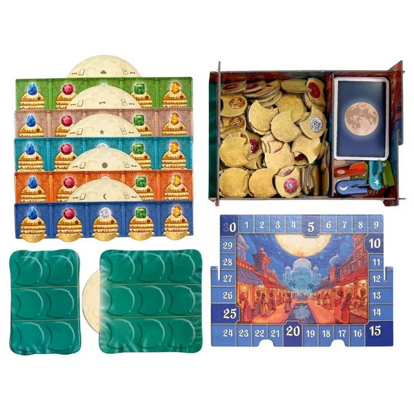 Minden huszonkilencedik éjszakán, amikor a telihold bevilágítja az eget, egy különös piac kel életre. A császár híres ékszergyűjteménye új mestert keres - valakit, akinek a kezében az arany életre kel, a drágakő mesélni kezd. A Holdfény bazár csak egyetlen éjszakán nyílik meg - és aki itt bizonyít, annak keze nyomát örökké viselni fogja az udvari ékszertár. A Holdfény bazár egy rafinált, mégis könnyed játék, ahol licitálással szerzel értékes köveket, majd háromszemű láncokká fűzöd őket a legjobb kombinációk reményében. Minél szebb a lánc, annál közelebb a hírnév és a győzelem. Légy részese az éjszaka varázsának - alkoss örökkévalót, s szerezz helyet a császár udvarában! A Holdfény bazár egy különleges licitálós és kombinációépítős társasjáték, amely a telihold fényében életre kelő piac varázslatos világába repít. A piac mindössze egy éjszakán át él – ez alatt kell megszerezned a legértékesebb drágaköveket, és a legtökéletesebb láncokat megalkotnod belőlük. A játékosok minden körben licittel versenyeznek a rendelkezésre álló kövekért, majd azokat háromszemű láncokká fűzik össze. A láncok színei, formái és sorrendje határozzák meg az értéküket, így minden döntés új lehetőségeket vagy kockázatokat rejt. A négy játékkör során a cél, hogy minél értékesebb kombinációkat hozz létre, és ezzel megszerezd a császár kegyét. A győzelemhez nem elég a szerencse: előrelátásra, taktikai érzékre és jó időzítésre is szükség lesz. A Holdfény bazár elegáns, mégis könnyen tanulható játék, amely ötvözi a licitálás izgalmát és a kombinációépítés örömét. Lépj be a fény és árnyék határán élő piacra, ahol a legügyesebb ékszerész neve örökre fennmarad. A Holdfény bazár egy nagyon könnyen tanulható társasjáték, 1 - 5 játékos részére, az átlagos játékidő rövidebb, csak 45 - 60 perc. A társast, a könnyebb tanulhatósága miatt, akár már 8 éves kortól ajánljuk kipróbálni. A játékmenet erősen épít a kollekció gyűjtés, az aukció/licit és a pakli tervezés mechanizmusokra.