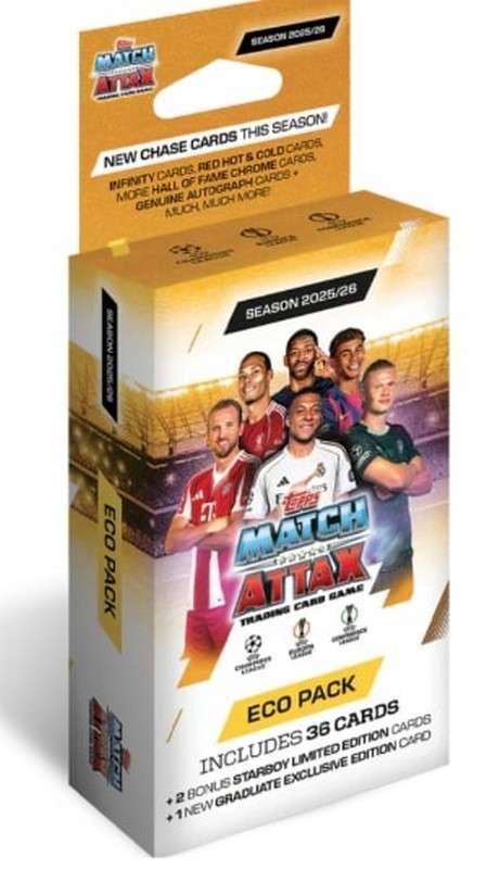 Színes és modern dizájn, amelyet az UEFA-Bajnokok Ligája 2025/26 hangulata és jellemzői ihlettek. Az UEFA-bajnokok ligája egy európai klubcsapatok részvételével játszott labdarúgósorozat, mely évente kerül megrendezésre. Kövesd a meccseket és gyűjtsd össze kedvenc csapataid focis kártyáit. Hivatalos UEFA bajnokok ligája kártya kollekció. Eco pack tartalma 36 kártya+1 free bonus limitált kártya.