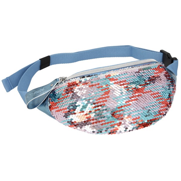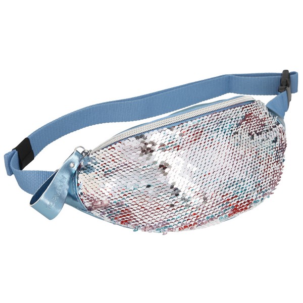 Flitterekből sosem elég! Trendi övtáska flitteres bevonattal, mely sellőszerű megjelenést biztosít. A flitterek simításával az ezüst és a világoskék árnyalatokkal játszhatsz. Hevederrel állítható és kapoccsal záródik a pánt, a táska zipzárral záródik. Mérete: 10 x 19 x 23 cm. Anyaga: Hátsó és cipzáras fogantyú: 100% PU, flitter: 100% PET, bélés: 100% PES:
